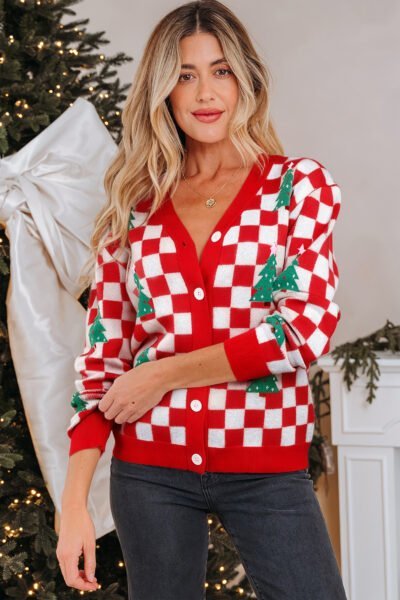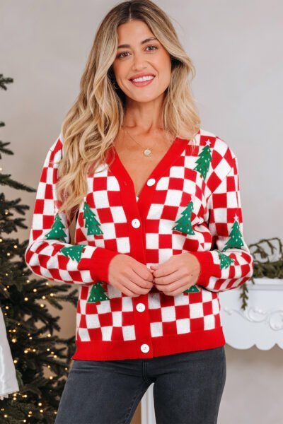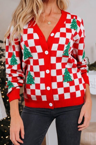 Red Checkered Christmas Tree Pattern Button V Neck Cardigan Sweater