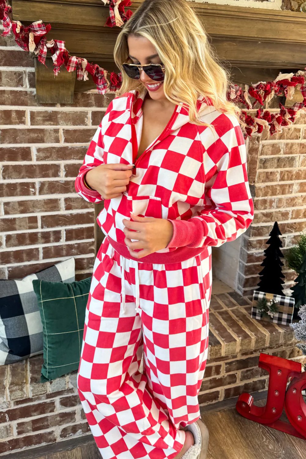 Red Checkered Print Half Zip Hoodie Loose Pant Set