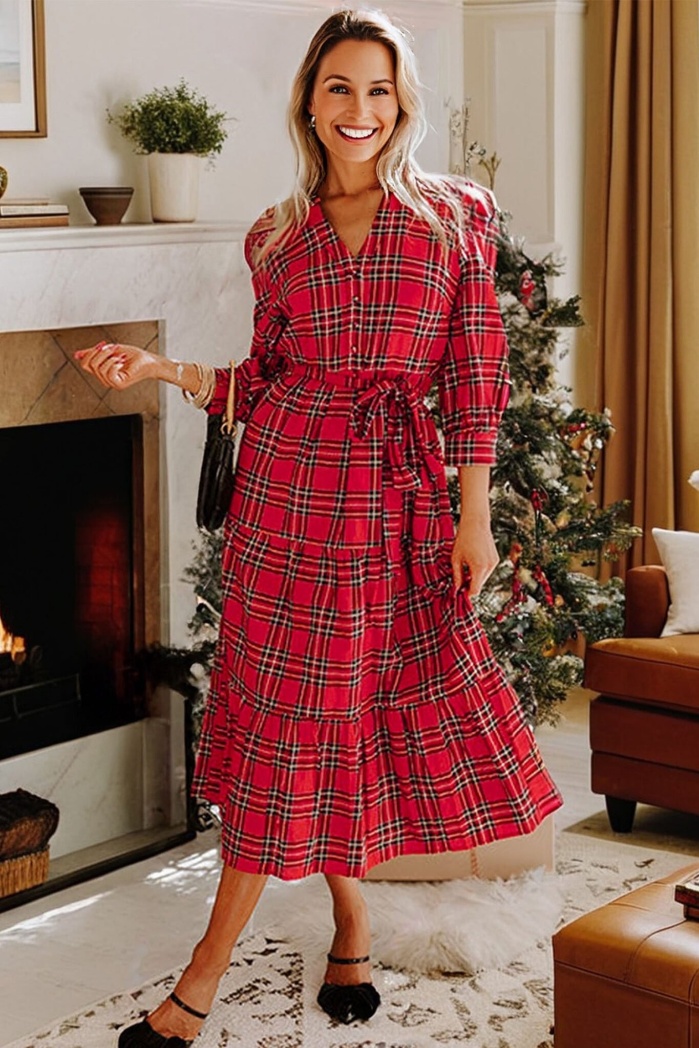 Red Christmas Plaid V Neck 3/4 Sleeve Tie Waist Ruffle Hem Long Dress