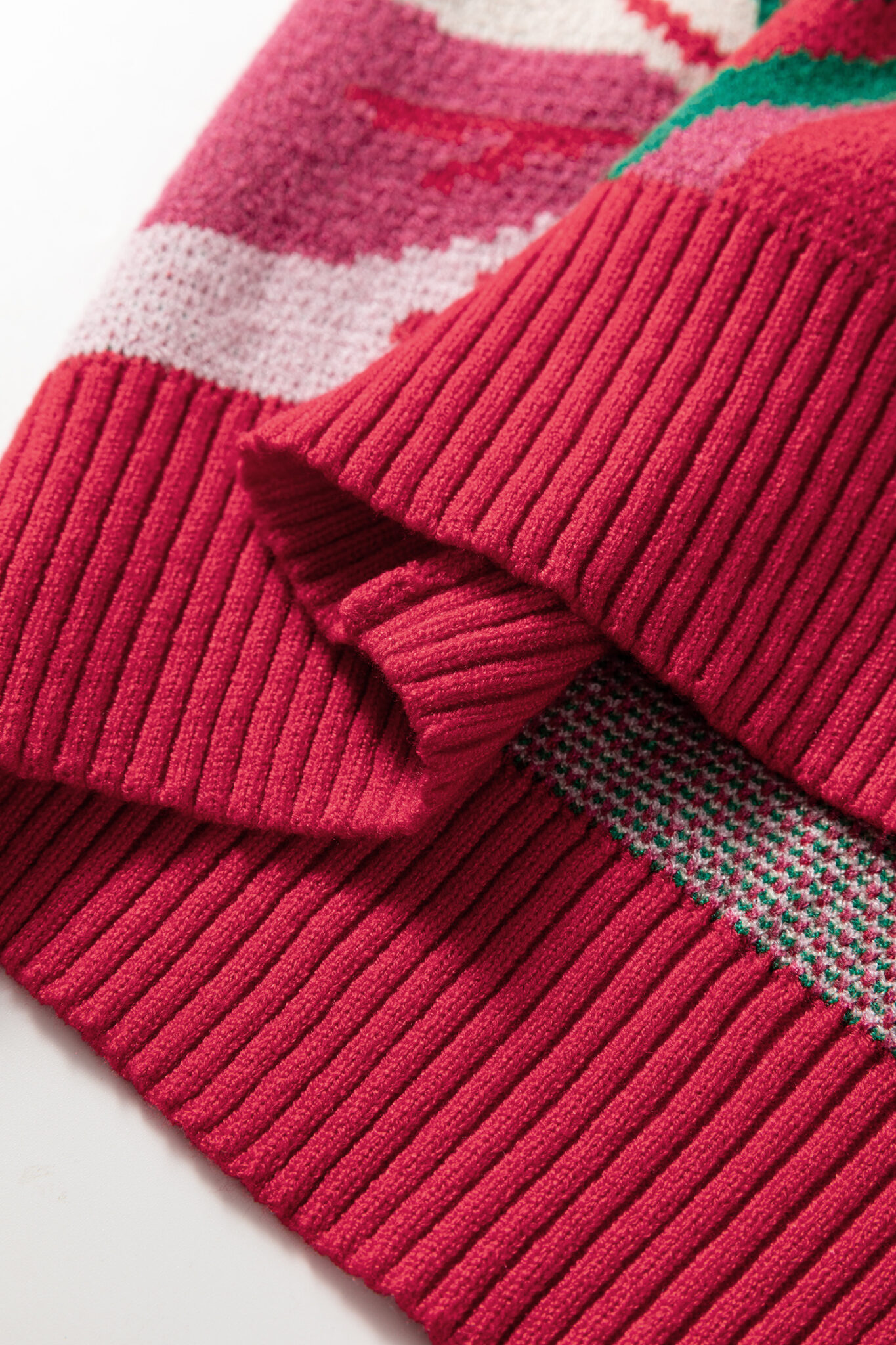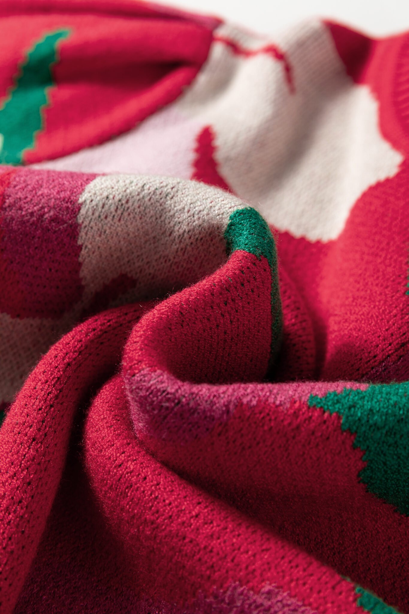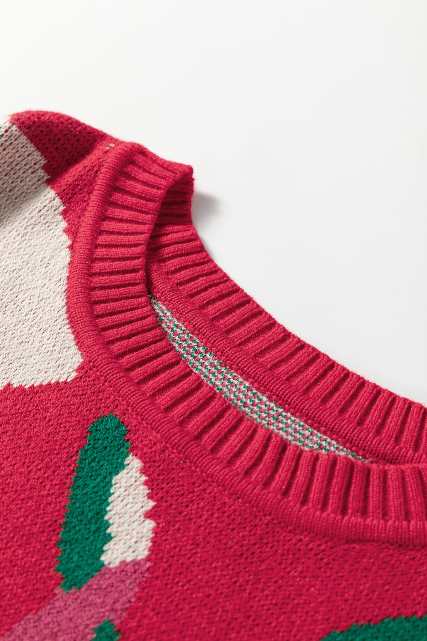Red Floral Abstract Print Short Puff Sleeve Sweater
