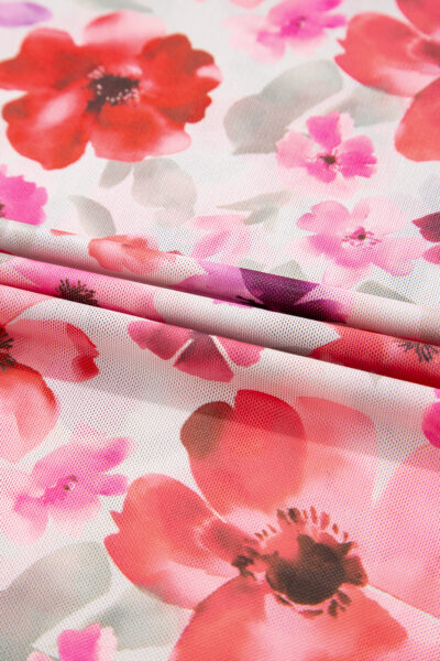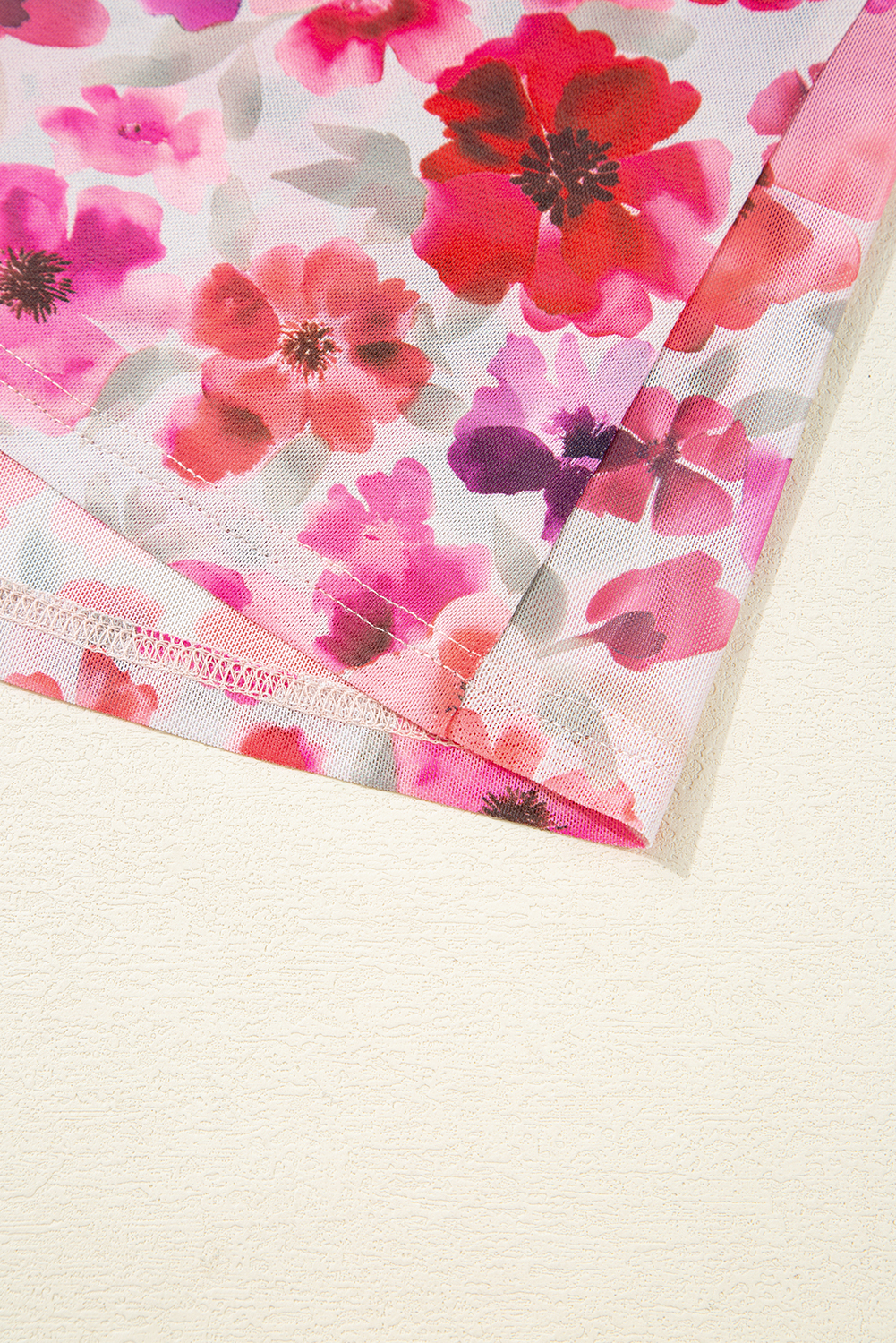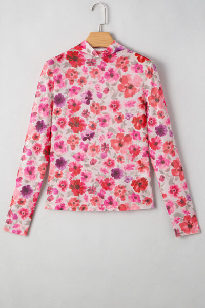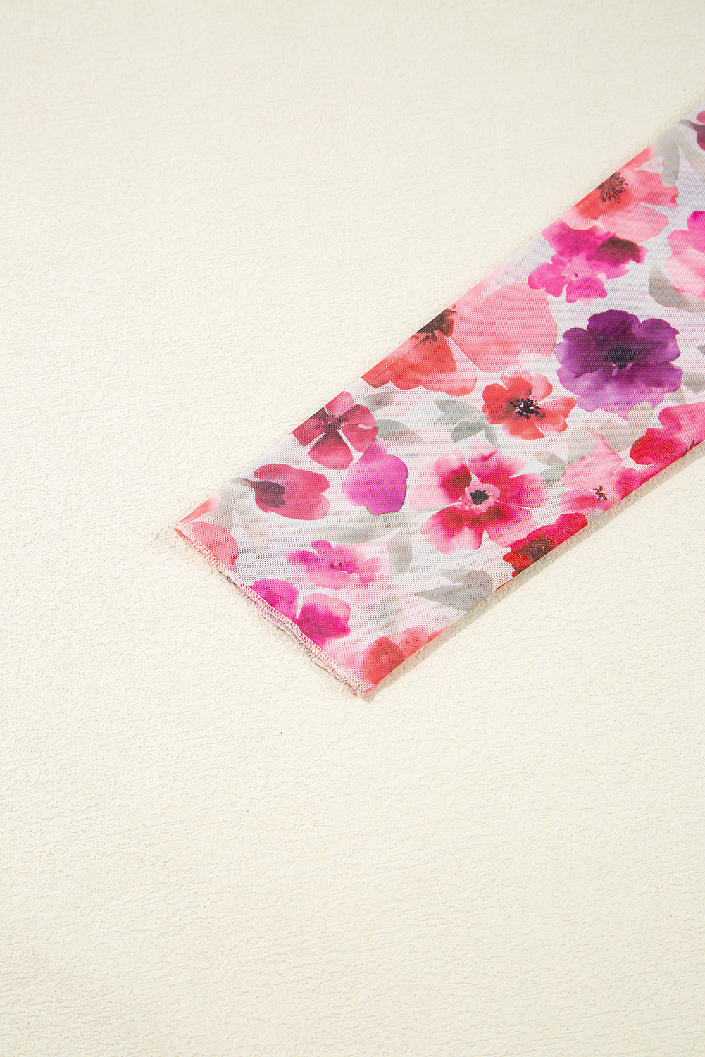 Red Floral Print Long Sleeve Slim Fit Mesh Top