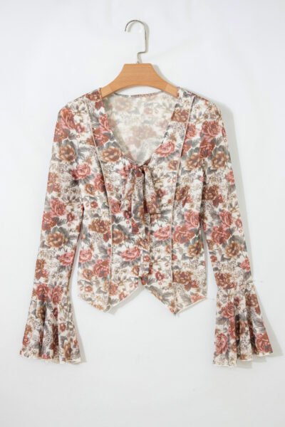 Red Floral Print Stitched Detail Tie V Neck Long Bell Sleeve Blouse