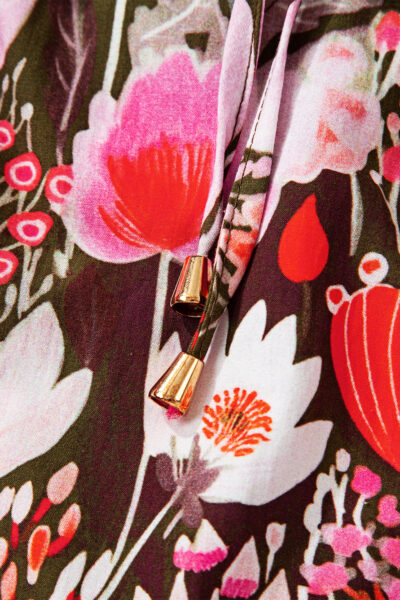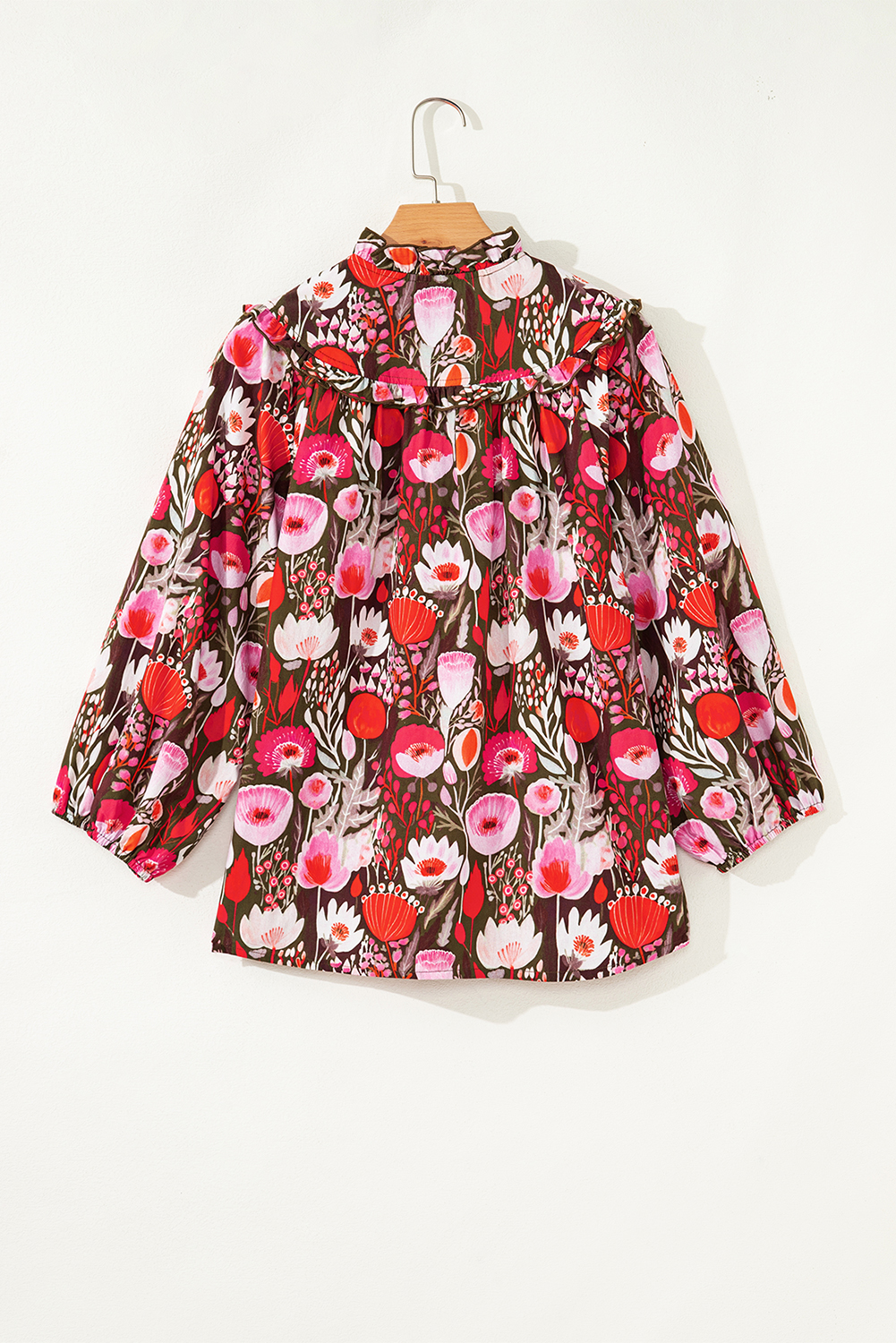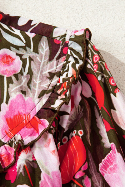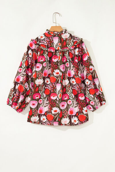 Red Floral Three Quarter Sleeve Lace-up Neck Blouse