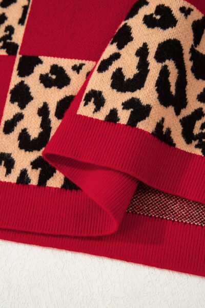 Red Leopard Checkerboard Short Sleeve Knit Sweater