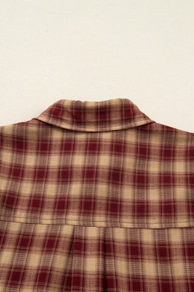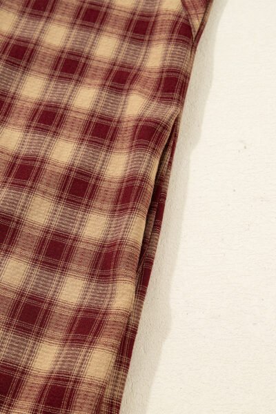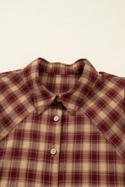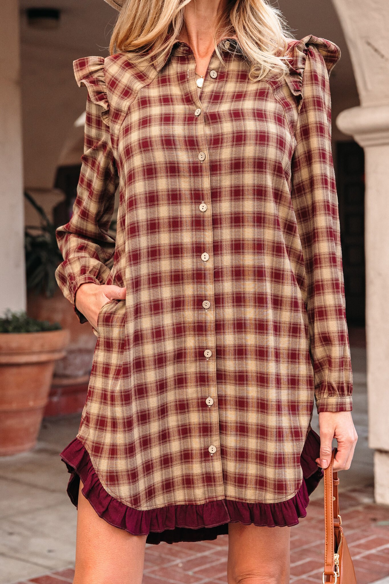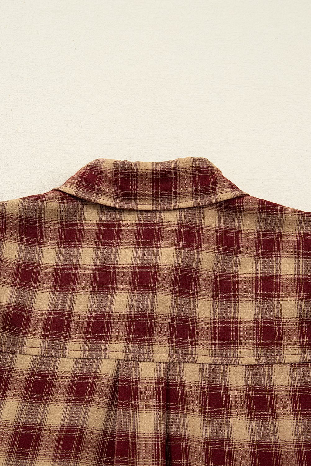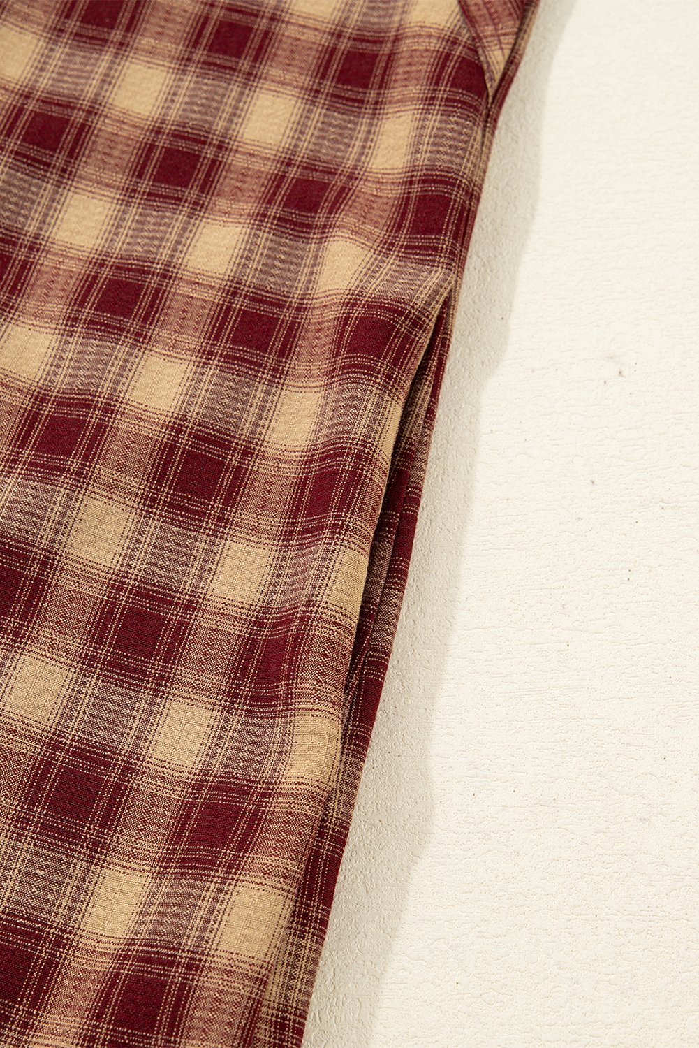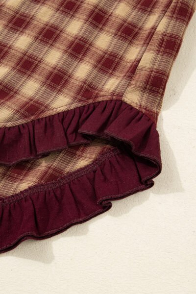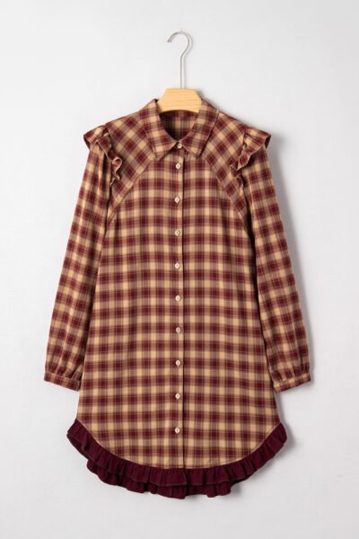 Red Plaid Print Ruffled Long Sleeve Patchwork Hem Mini Shirt Dress