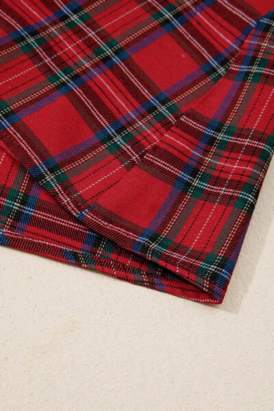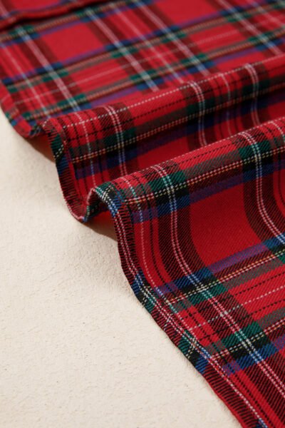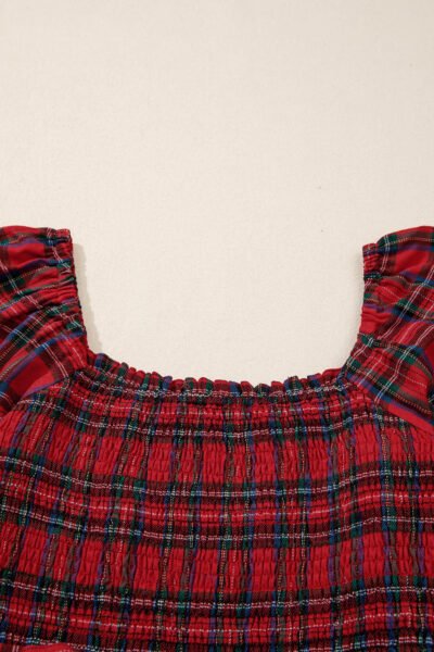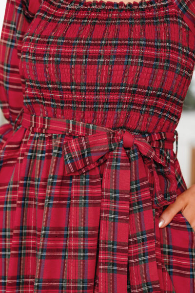 Red Tartan Plaid Square Neck Puff Sleeve Knot Waist Flared Midi Dress