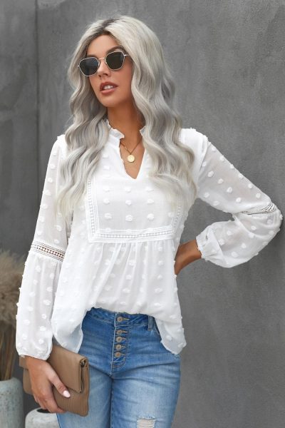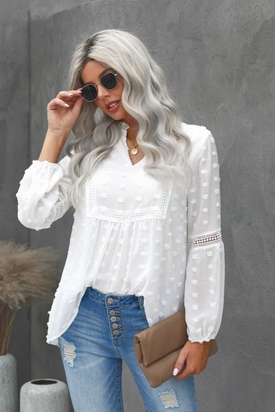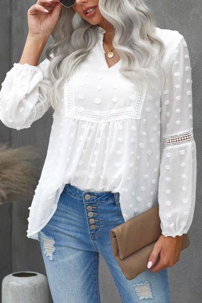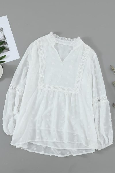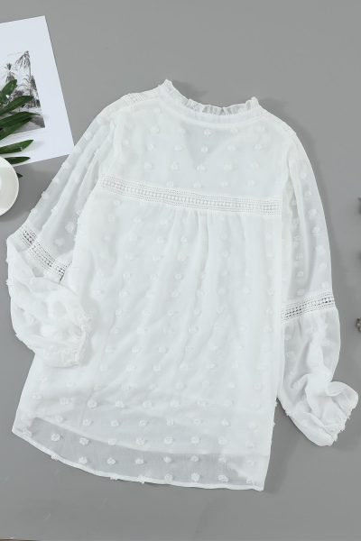 Roberta Women’s Swiss Dot Split Neck Ruffle Babydoll Blouse White