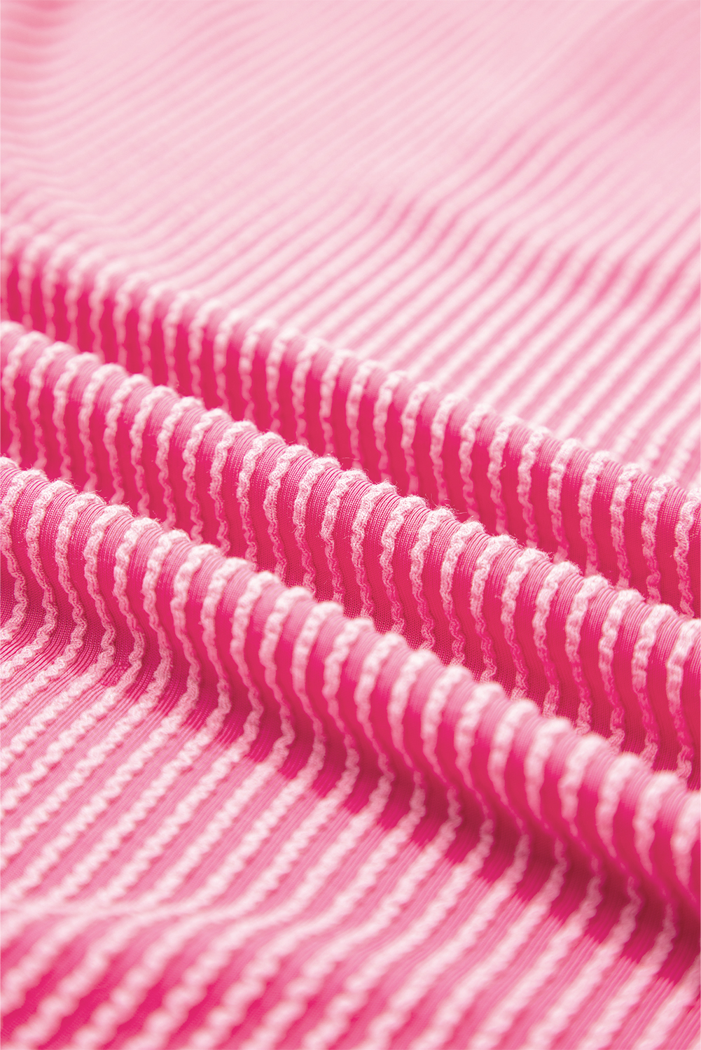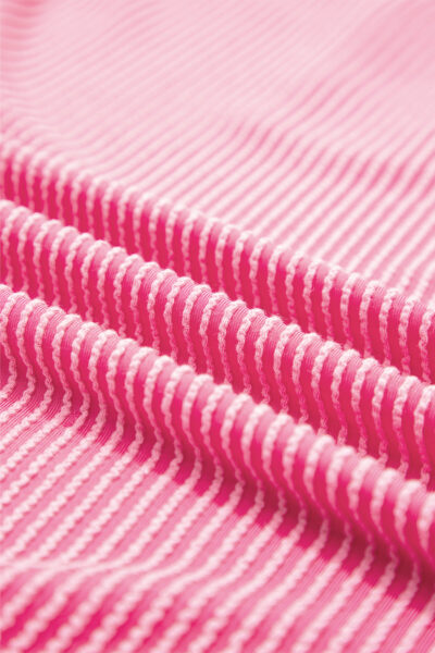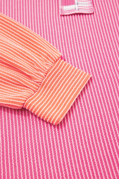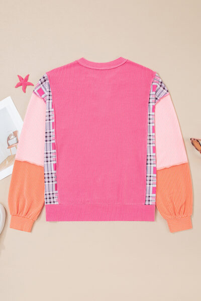 Rose Red Corded Texture Plaid Colorblock Patchwork Split Neck Long Sleeve Top