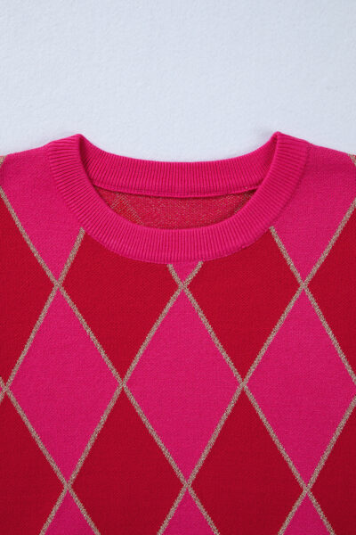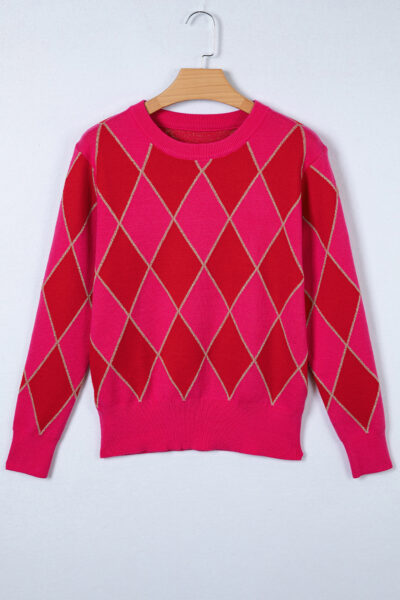 Christmas Rose Red Glitter Rhombus Pattern Knit Womens Casual Sweater