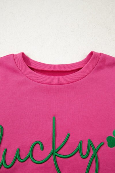 - Lucky clover embroidery adds festive charm to this glowing sweatshirt.