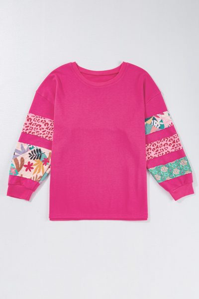 Rose Red Plus Size Printed Patchwork Sleeve Split Sweatshirt