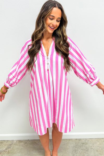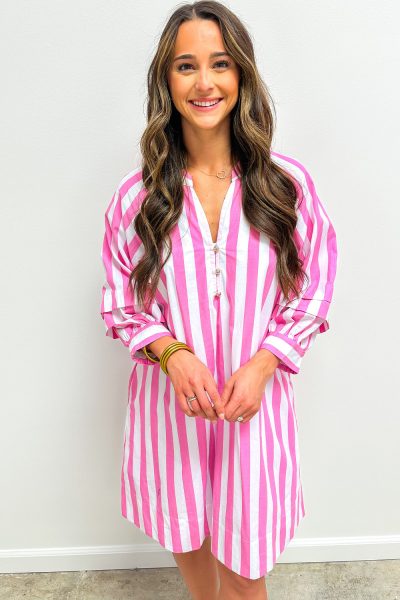 Rose Stripe Bracelet Sleeve Buttons Loose Mini Dress