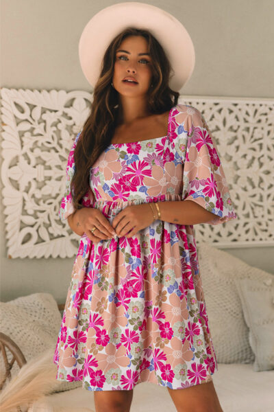 Rose Summer Floral Square Neck Puff Sleeve Babydoll Dress