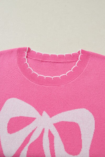 Sachet Pink Big Ribbon Bow Print Contrast Stitch Trim Drop Shoulder Sweater
