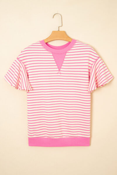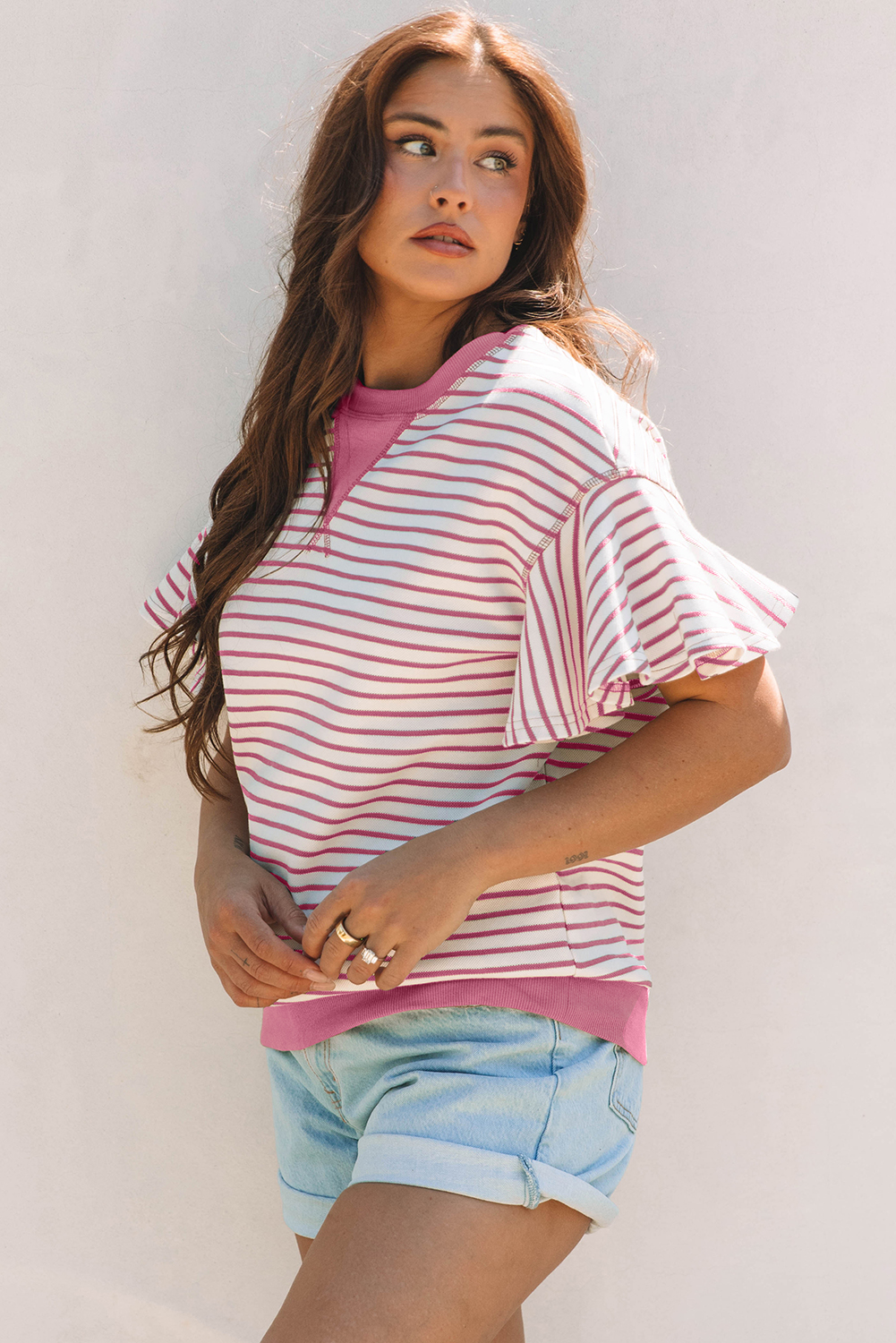 Sachet Pink Contrast Detail Striped Ruffle Short Sleeve Top