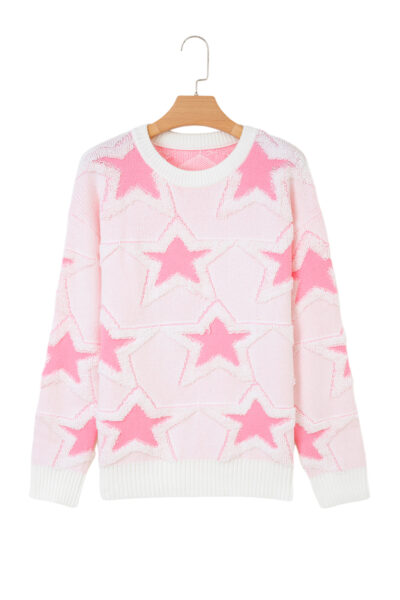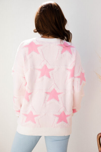 Sachet Pink Oversized Cute Star Pattern Ribbed Edge Drop Shoulder Sweater
