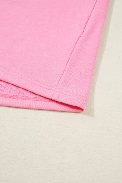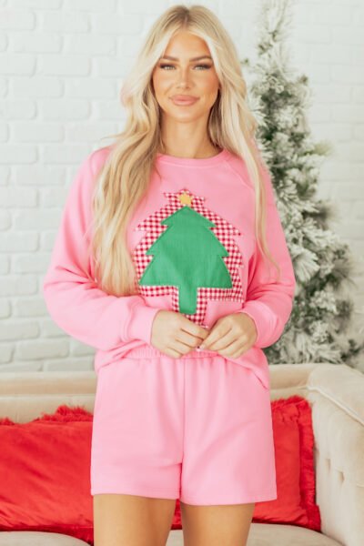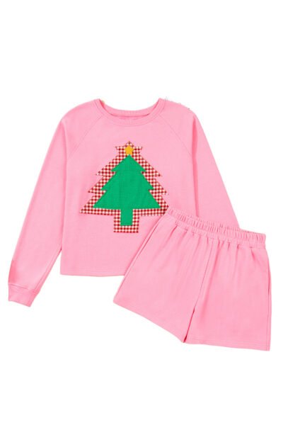 Sachet Pink Plaid Contrasted Double Christmas Tree Patched Raglan Sleeve Pullover 2pcs Short Set