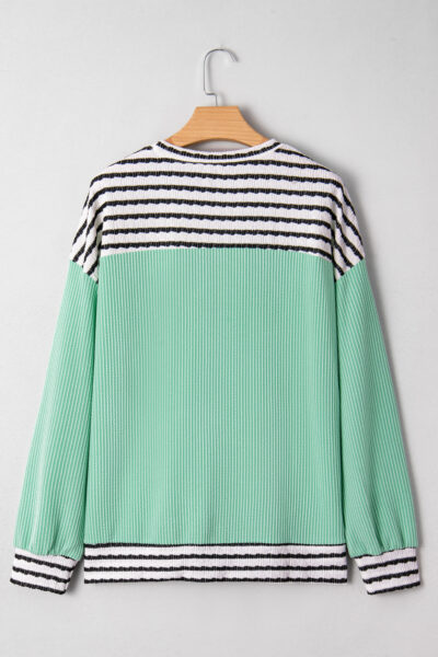 Sea Green Twisted Ribbed Contrast Round Neck Striped Patchwork Long Sleeve Top