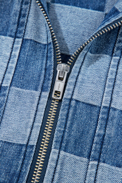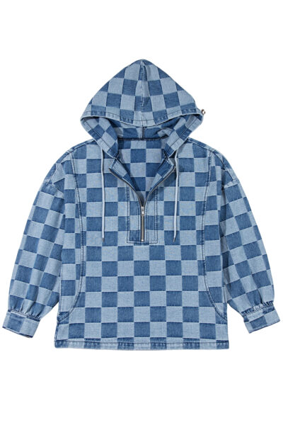 Sky Blue Checkerboard Zipped Neck Kangaroo Pocket Denim Hoodie
