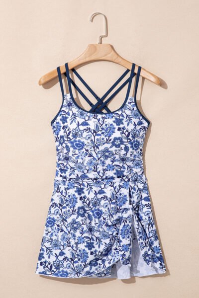 Sky Blue Crossed Back Floral Print Asymmetric Knot Side One Piece Swimsuit