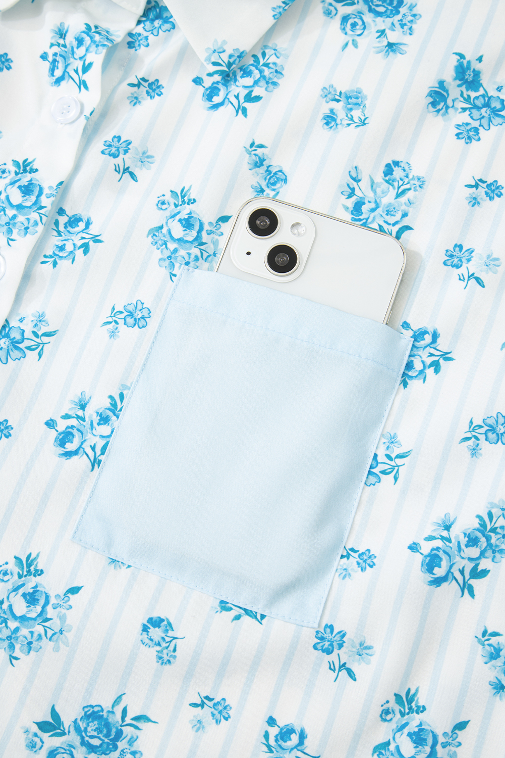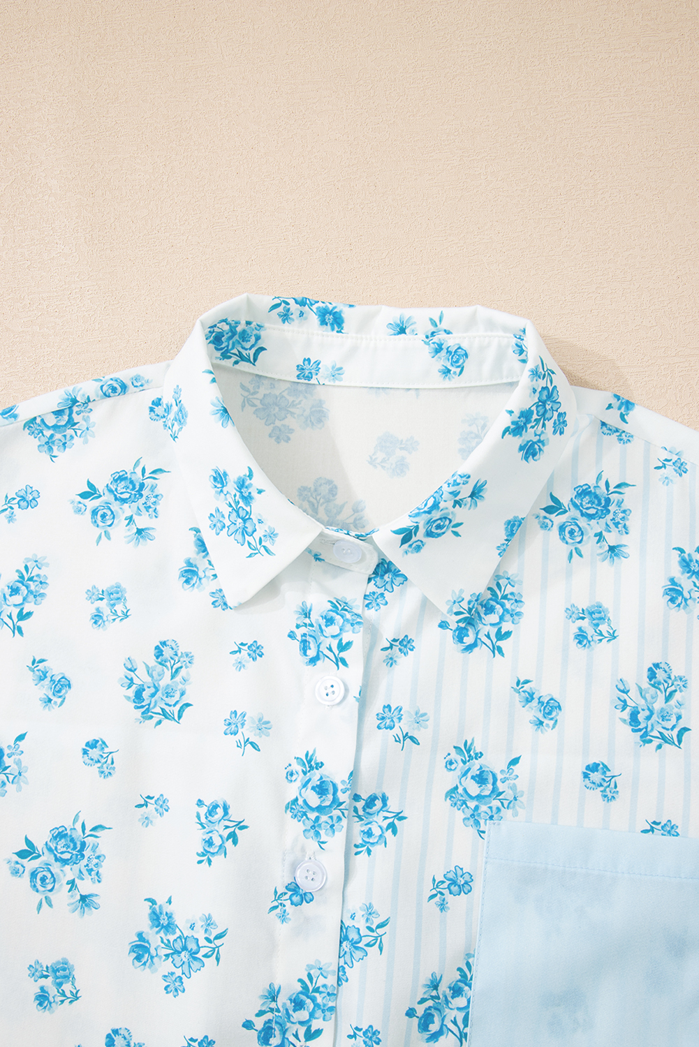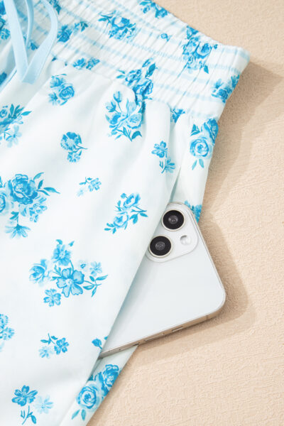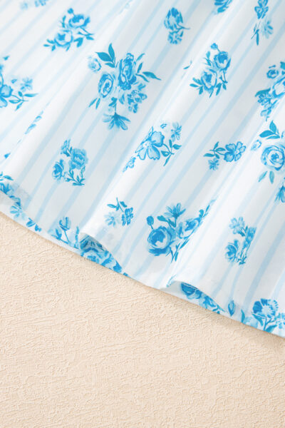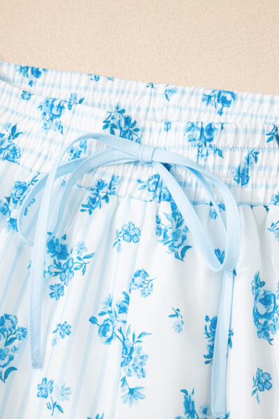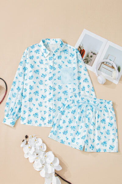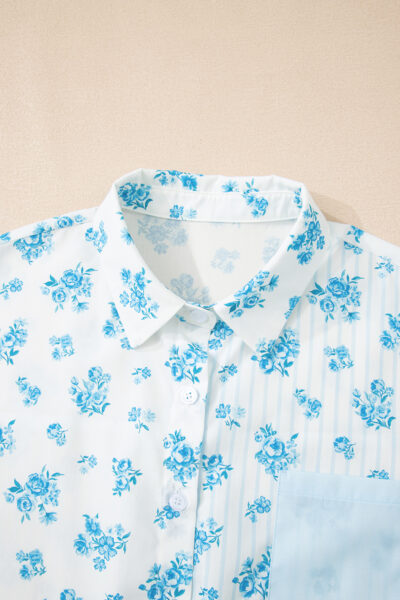 Sky Blue Floral Striped Print Contrast Patched Pocket Shirt and Shorts Set