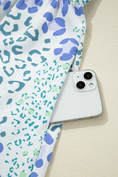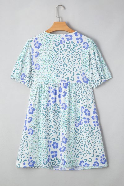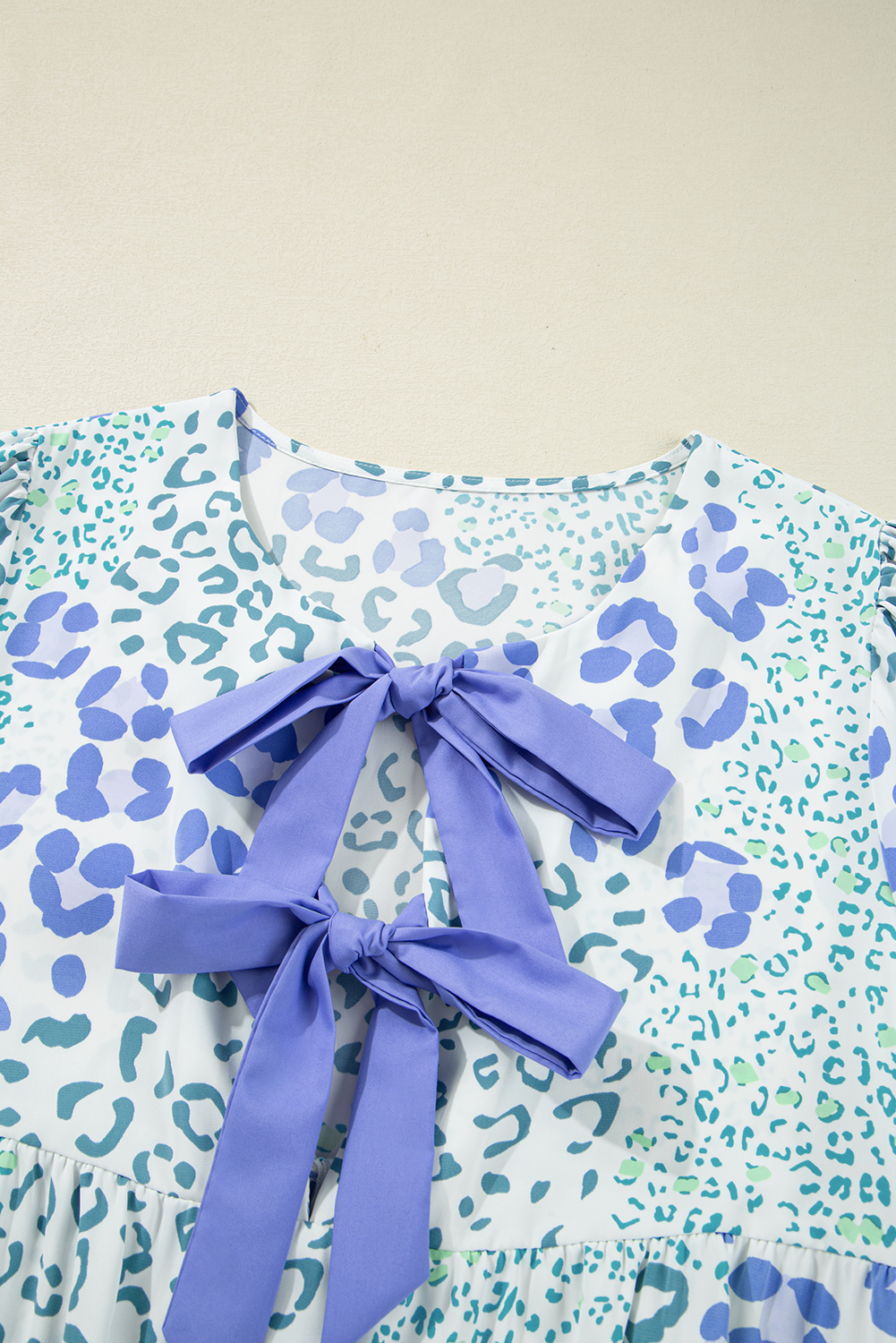 Sky Blue Leopard Contrast Bow Puff Sleeve Mini Dress
