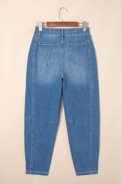 Trendy barrel leg jeans pair easily with tees or sweaters.