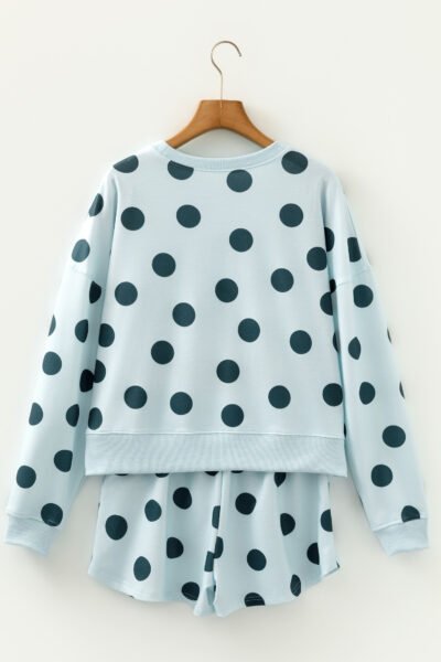 Sky Blue Polka Dot Print Drop Shoulder Pullover Drawstring Shorts Set