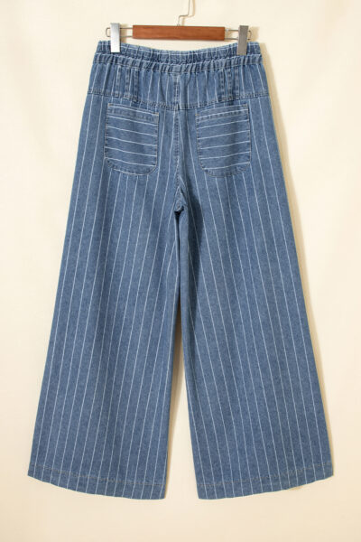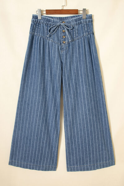 Sky Blue Stripe Button Pleated Drawstring Waist Casual Wide Leg Jeans