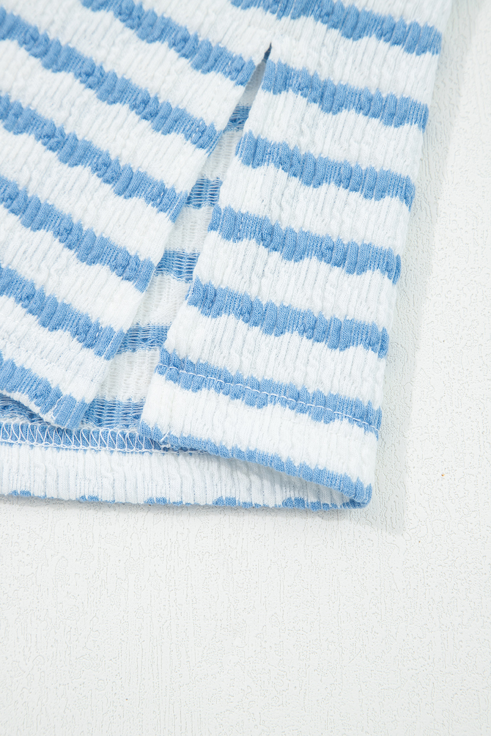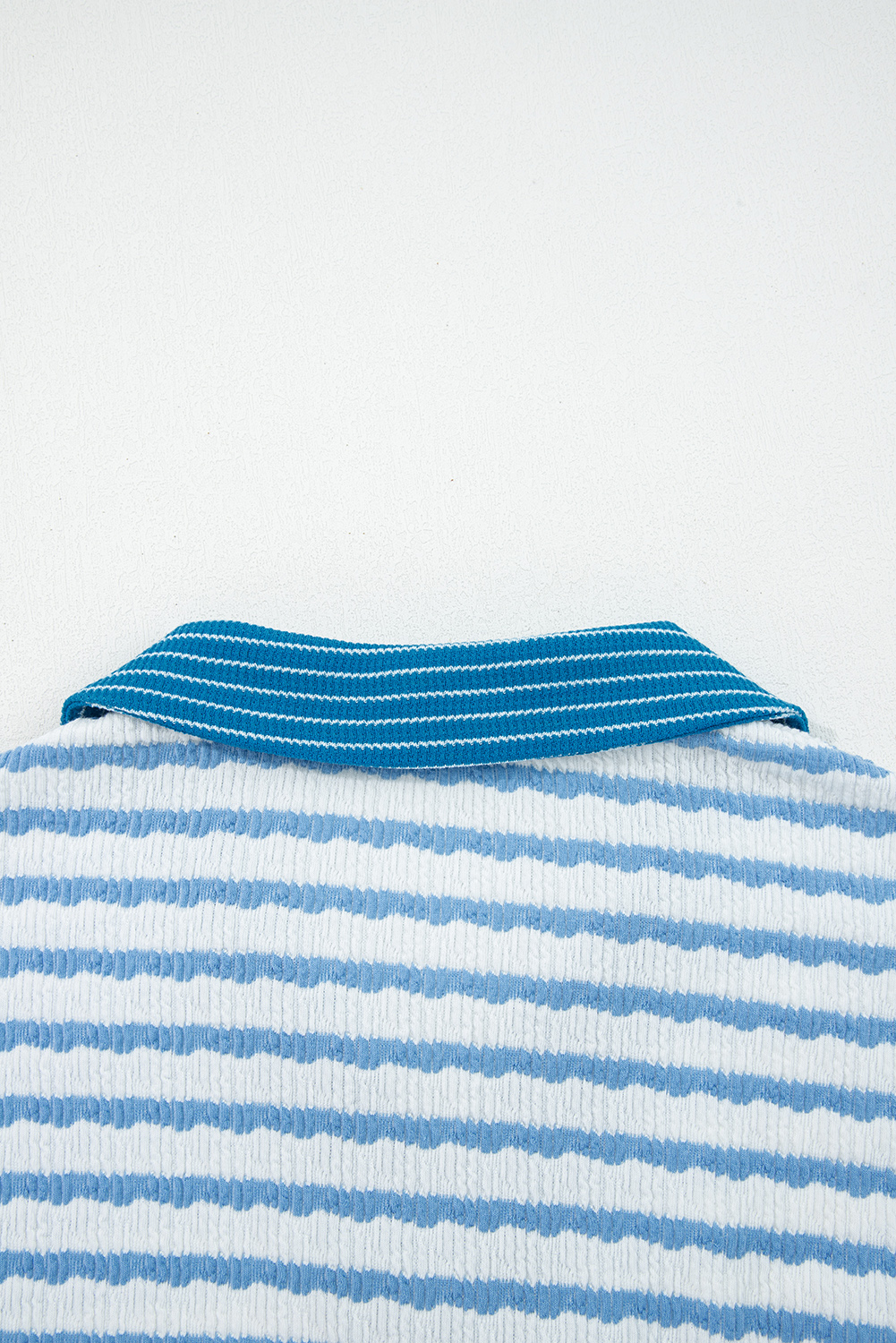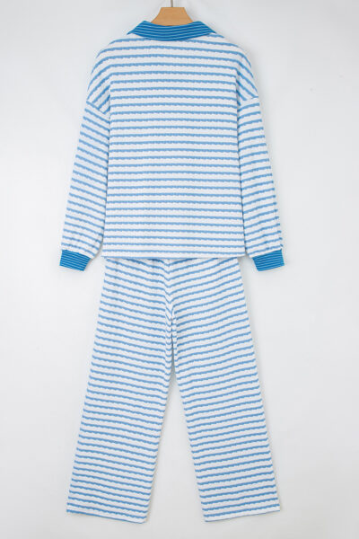 Sky Blue Stripe Collared Pullover Top and Drawstring Pant Set