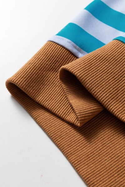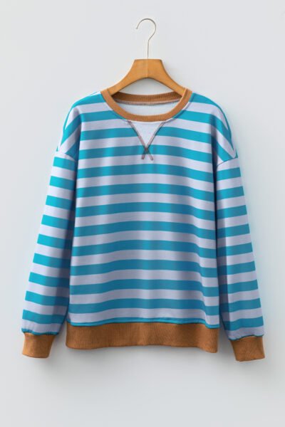 Sky Blue Stripe Contrast Color Ribbed Trim Round Neck Drop Shoulder Sweatshirt