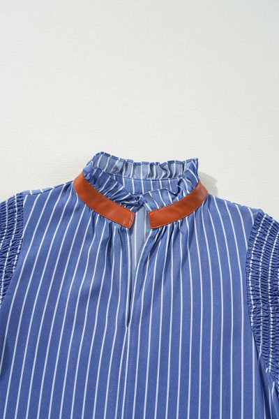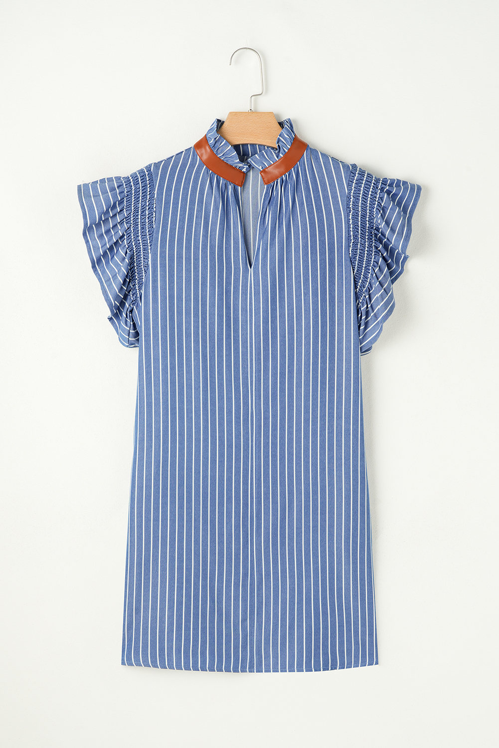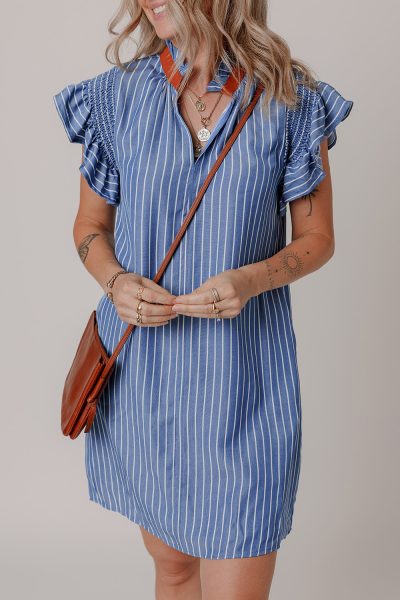 Sky Blue Stripe Frilly Split Neck Shirred Ruffle Sleeve Short Shift Dress