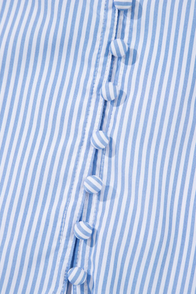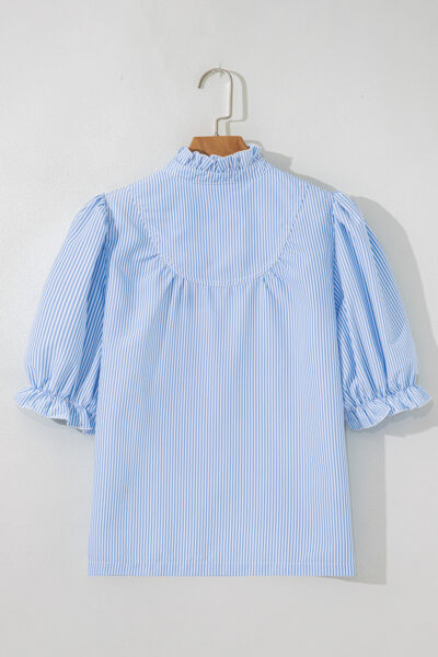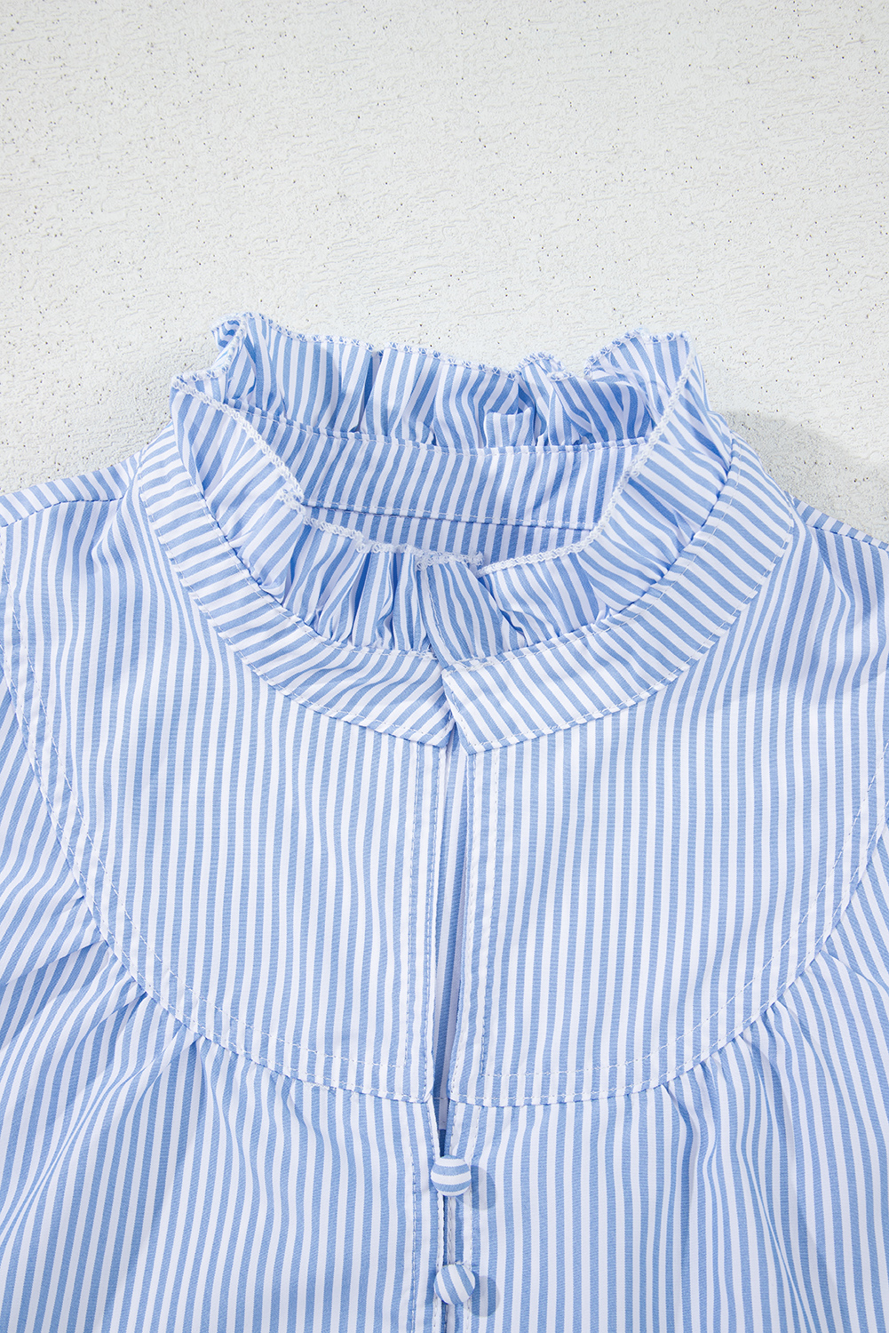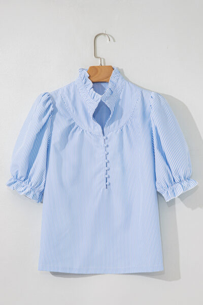 Sky Blue Stripe Ruffled Collar Puff Sleeve Half Buttons Blouse