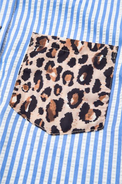 Sky Blue Striped Leopard Print Patchwork Button Up Womens Shirt