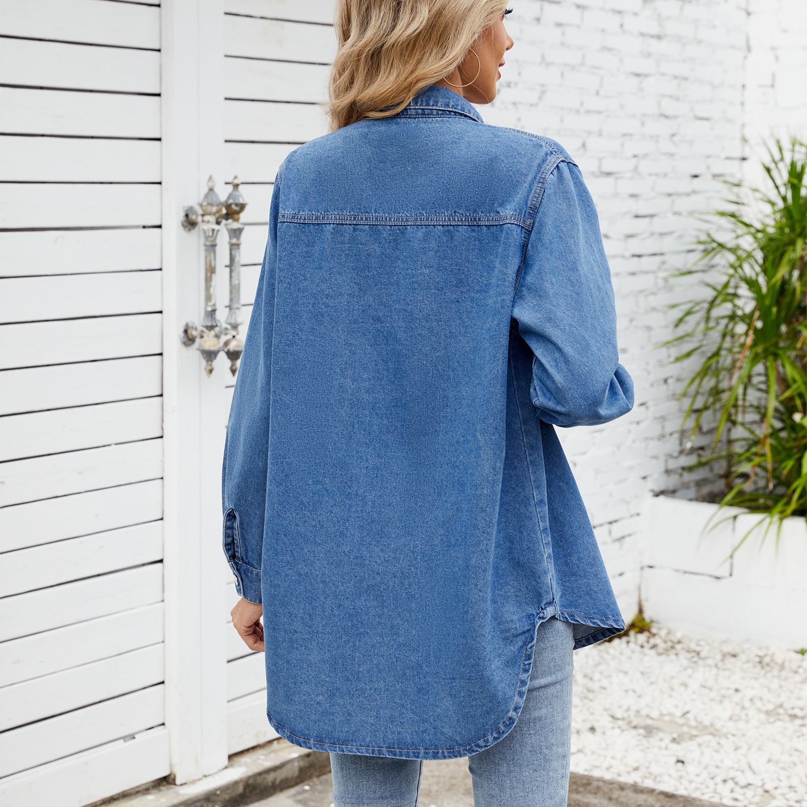 Sky blue washed loose fitting long sleeve denim shacket