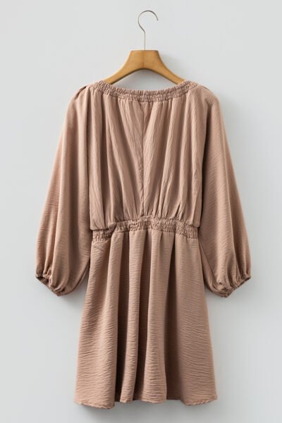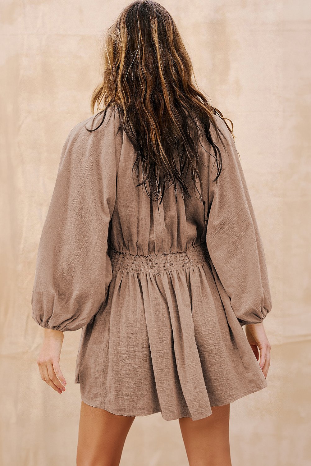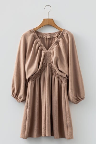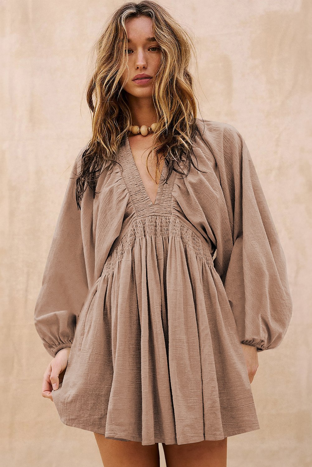 Smoke Gray Deep V Neck Bubble Sleeve Smocked Mini Dress