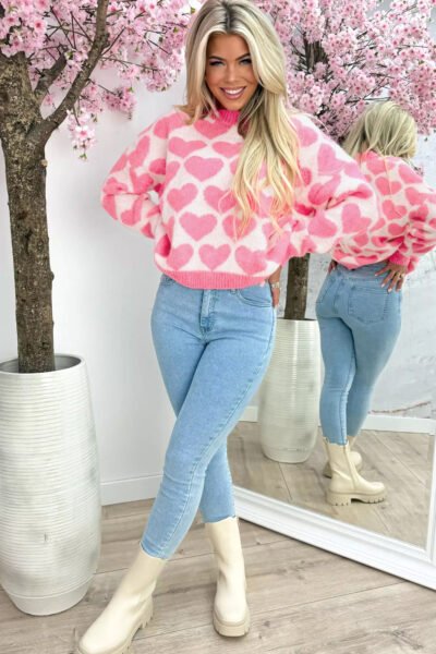 Strawberry Pink Valentine Heart Print Knit Sweater