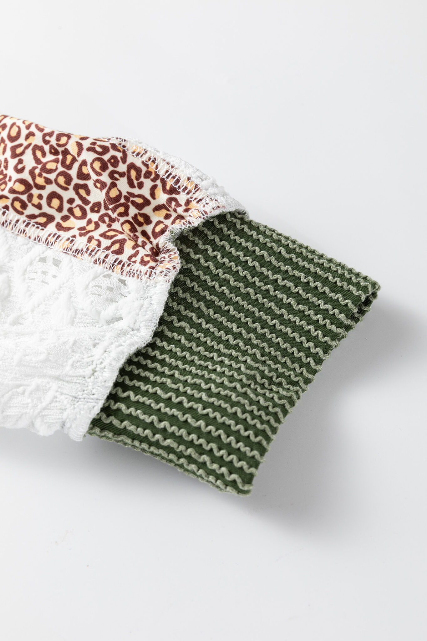 Vineyard Green Twisted Ribbed Leopard Lace Contrast Patchwork Long Sleeve Top