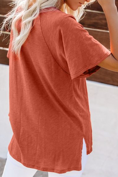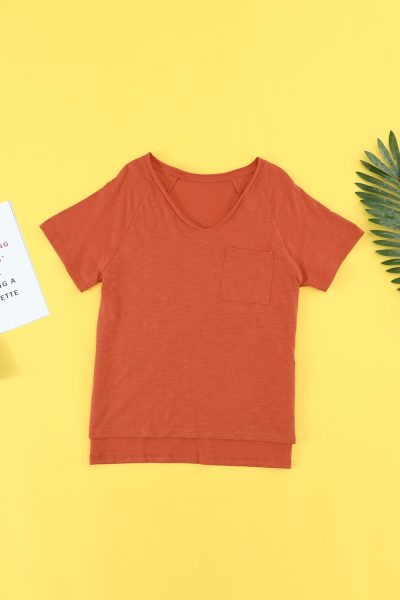 Viola Women’s V Neck Short Sleeves Cotton Blend Tee with Front Pocket and Side Slits Orange