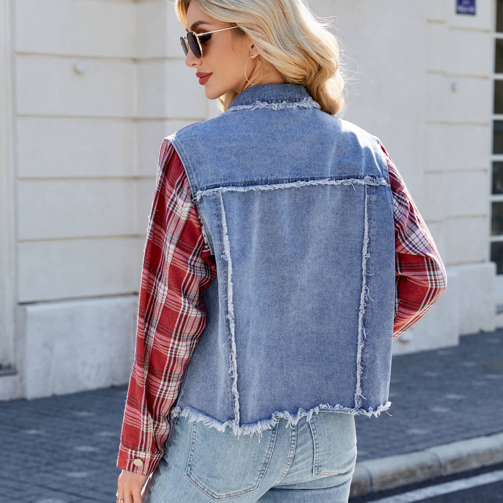 Washed Long Sleeve Plaid Patchwork Fringe Denim Jacket
