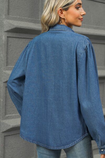 Washed Vertical Stripe Textured Long Sleeve Denim Shirt