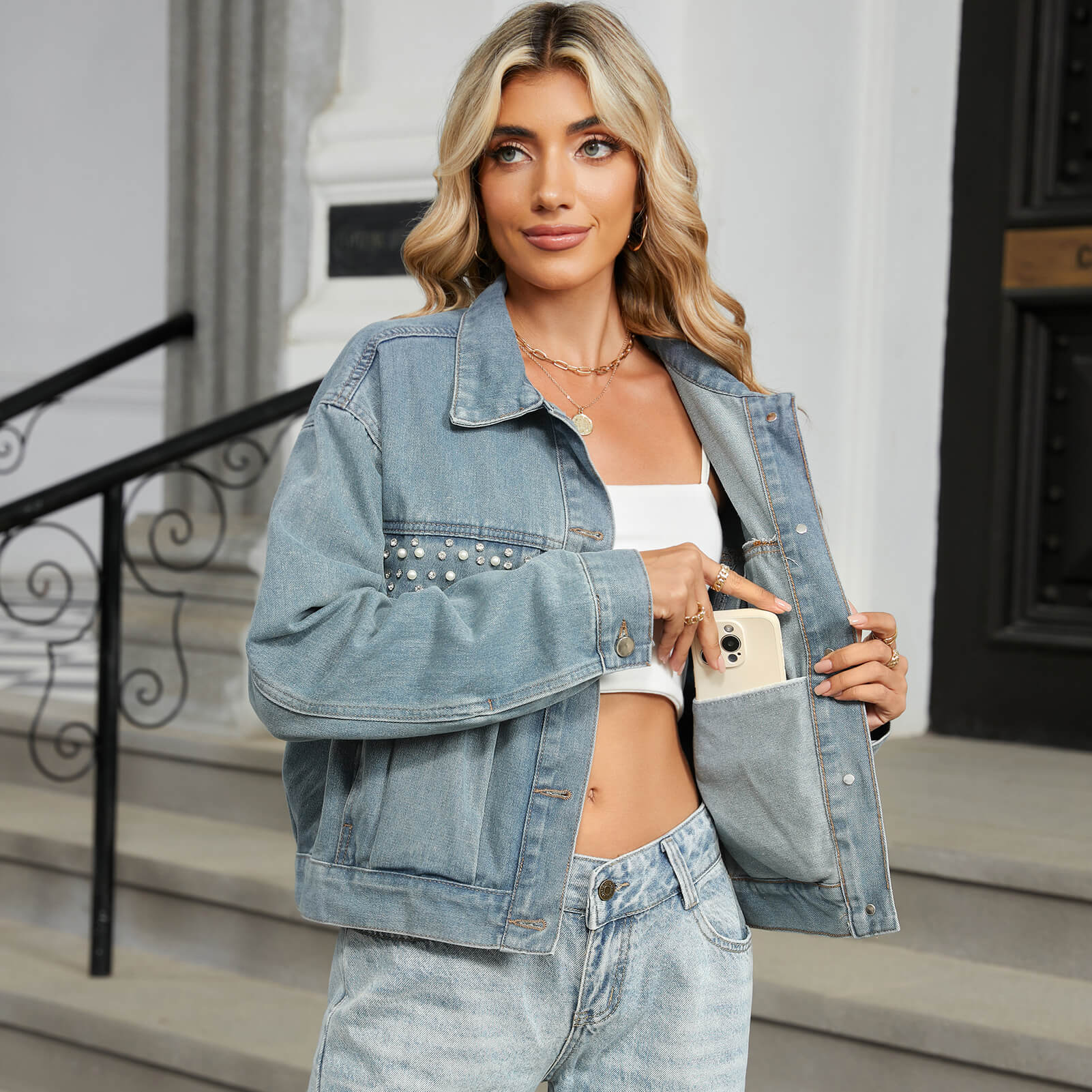Washed Vintage Denim Jacket with Rhinestone & Pearl Embellishments