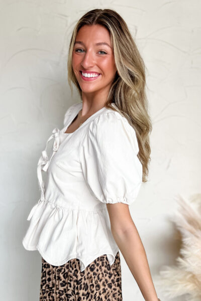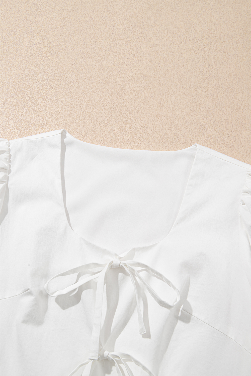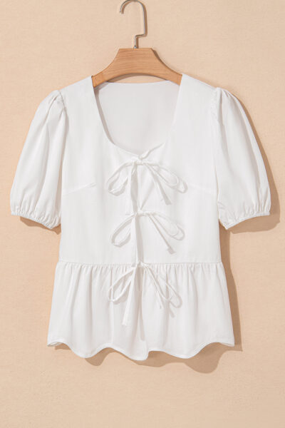White Bow Knot Decor Square Neck Puff Sleeve Peplum Top