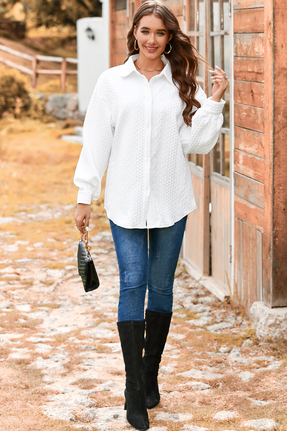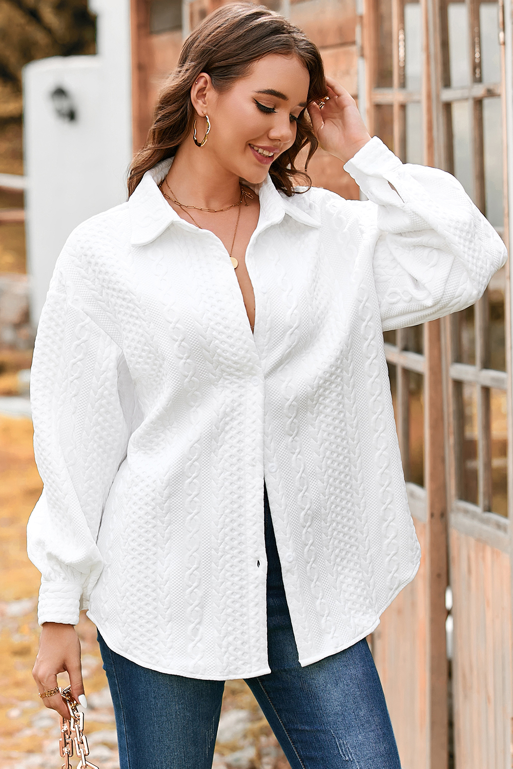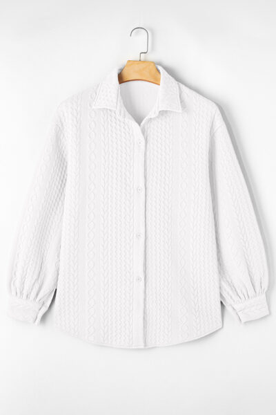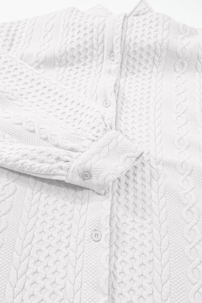 White Cable Texture Puff Sleeve Loose Shacket