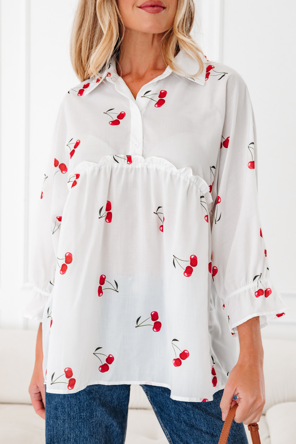 White Cherry Print Flounce Sleeve Collared Frilled Babydoll Blouse