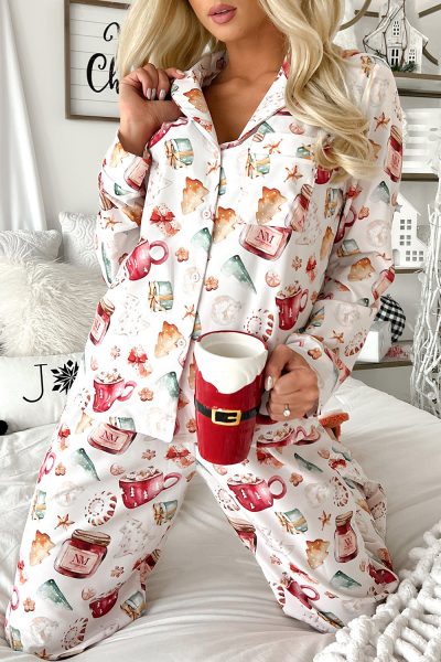 White Christmas Pattern Long Sleeve Shirt and Pants Pajama Set