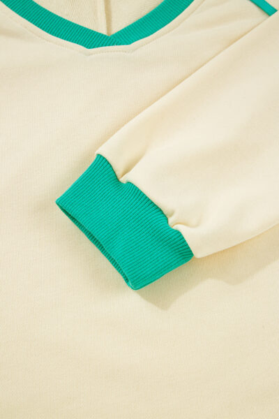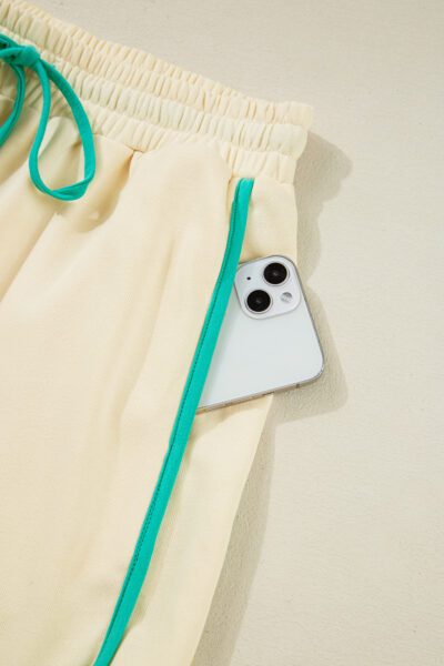 White Contrast Trim Colorblock Long Sleeve Pullover and Drawstring Shorts 2pcs Outfit
