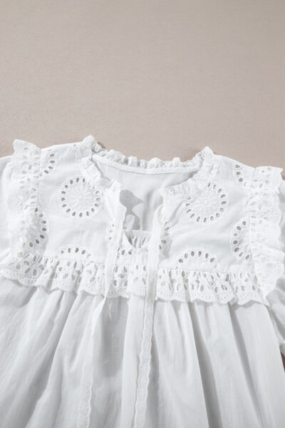 White Embroidered Lace Patchwork Tie Neck Puff Short Sleeve Blouse