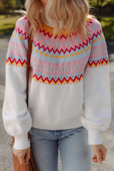 White Ethnic Geometric Colorblock Print Drop Shoulder Sweater