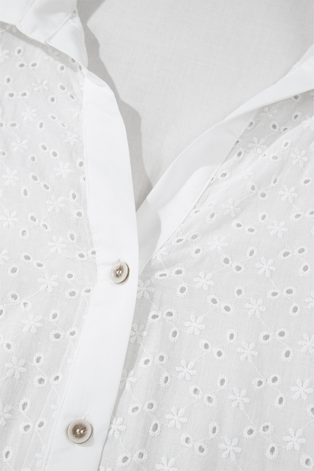 White Floral Embroidered Puff Sleeve Eyelet Patchwork Shirt
